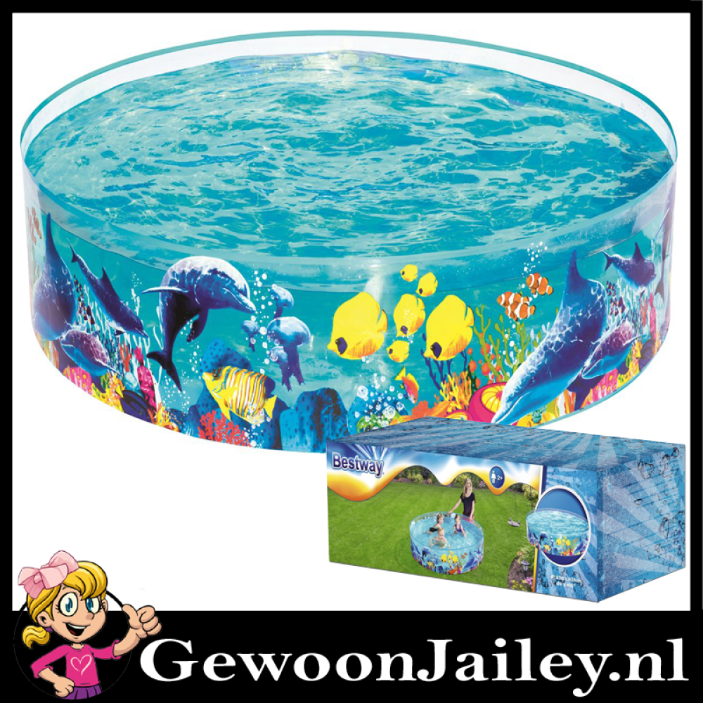 Kinderbad met vaste zijwanden van PVC met "seaworld" print en aangehechte sterke vinyl bodem. Incl. reparatie patch. Watercapaciteit: 946 ltr. Leeftijd: 2+. Afmeting: Ø 183x38 cm.